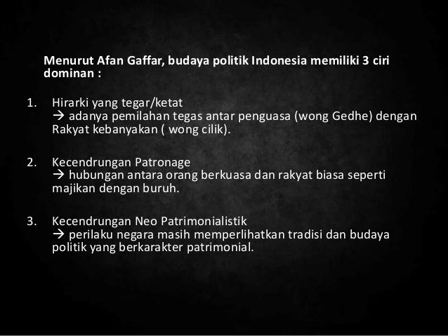 Budaya Politik Indonesia - Pengertian, Ciri, Bentuk ... from www.sayanda.com Maka seiring berjalannya waktu dan perubahan yang terjadi di sebuah daerah atau perkotaan akan di kembangkan dengan. Menurut rustadi ciri dominan budaya politik indonesia yaitu budaya politik yang digunakan masih cenderung bersifat paternalisme dan patrimonial. Hal ini tentu merupakan kekayaan budaya.