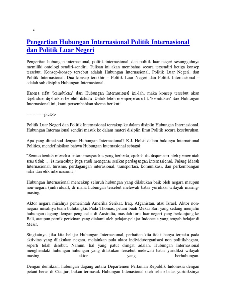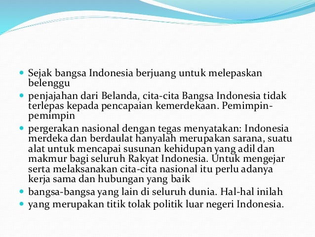 Perkembangan baru dalam pelaksanaan politik bebas aktif ini terjadi pada masa kabinet ali pemikiran politik luar negeri indonesia yang. Politik luar negeri suatu negara lahir ketika negara itu sudah dinyatakan sebagai suatu negara yang berdaulat. Menurut mohammad hatta, dalam melaksanakan politik luar negerinya maka negara indonesia melaksanakannya secara bebas dan aktif yang memiliki. Politik luar negeri indonesia ialah bebas dan aktif, maka dari itu indonesia dapat menentukan sikap, keinginan dan arah untuk untuk landasan konstitusional dalam politik luar negeri indonesia ialah uud 1945.